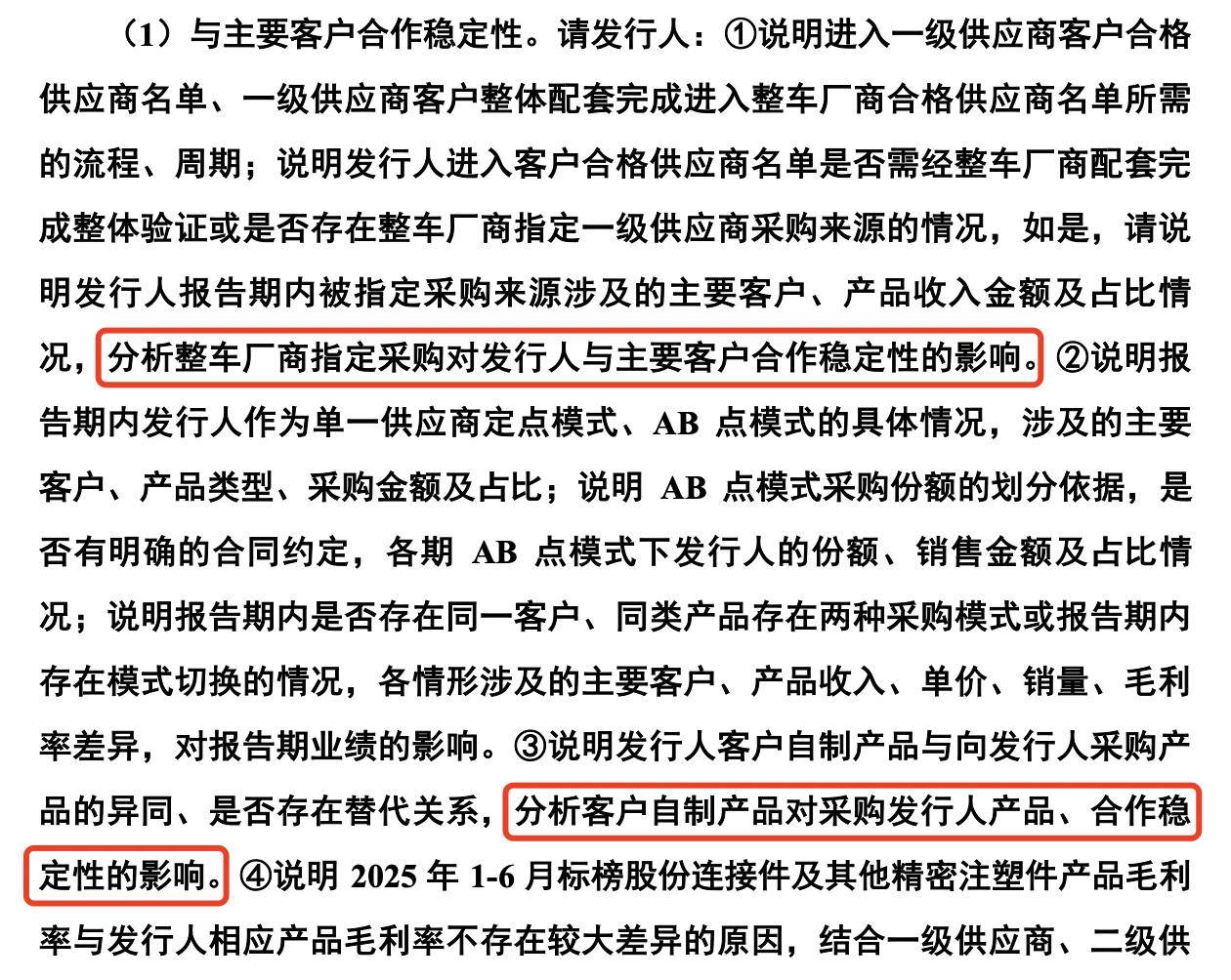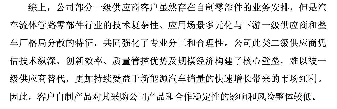 据其指出,公司此类二级供应商凭借技术纵深、创新效率、质量管控优势及规模经济构建了核心壁垒,难以被一级供应商替代,更加持续受益于新能源汽车销量的快速增长带来的市场红利。因此,客户自制产品对其采购公司产品和合作稳定性的影响和风险整体较低。