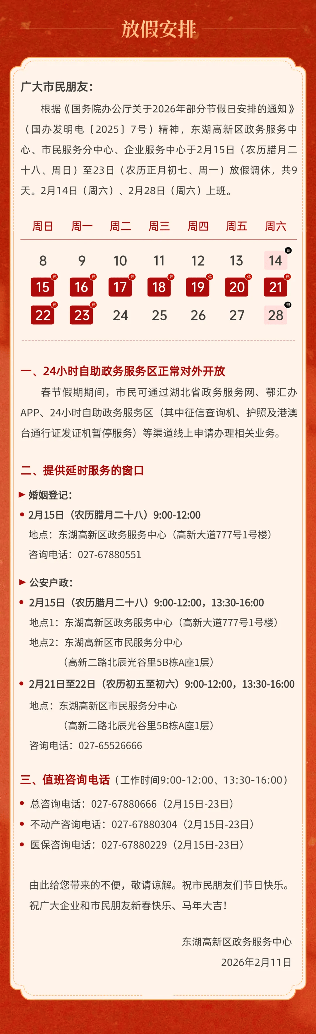 为满足春节期间群众办事需求,东湖高新区全力保障节日期间服务“不断档”、质量“不打折”、“便民不打烊”。